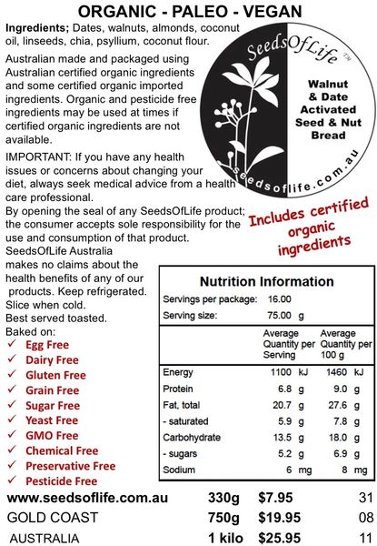 Sunflower seeds, Linseeds, Chia seeds, Psyllium, Coconut flour, Coconut oil, Almond meal, Dates, Walnuts, Water