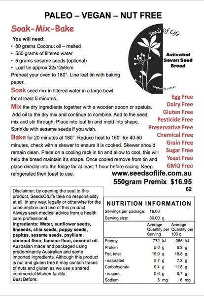 Poppy seeds, chia seeds, sunflower seeds, pepitas, linseeds, psyllium husks, coconut flour, banana flour, coconut oil, water.
