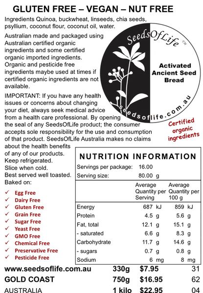 All Organic Ingredients: Quinoa, buckwheat flour, coconut flour, banana flour, linseeds, chia seeds, psyllium coconut oil, filtered water.