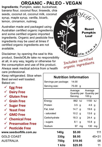 Buckwheat, pumpkin, linseed, chia seeds, coconut flour, banana flour, vanilla bean, Bicarb, maple syrup, coconut syrup, lemon juice, nutmeg, pepitas, coconut oil.