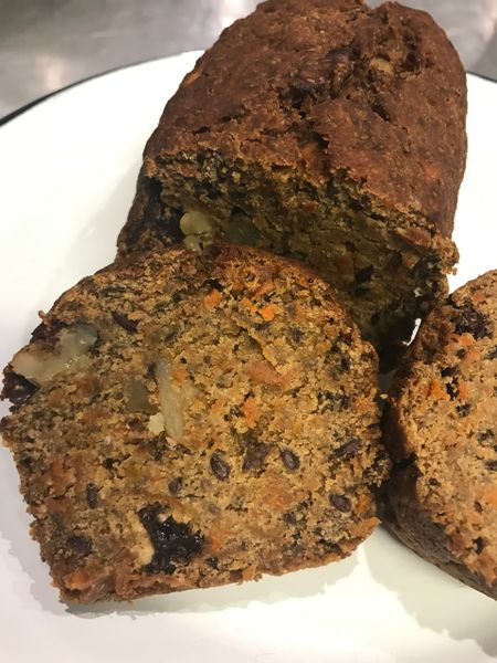 Banana flour, coconut flour, coconut syrup, coconut oil, buckwheat, bicarbonate, carrot, walnuts, raisins, chia seeds, linseeds, coconut oil, lemon, coconut milk.