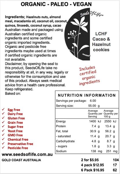 Hazelnuts, cacao, almond meal, coconut oil, coconut, quinoa, linseeds, coconut syrup, bicarb.