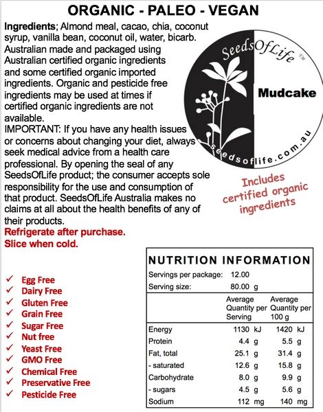 All Organic Ingredients: Almond meal, cacao, chia seeds, coconut syrup, maple syrup, vanilla bean, coconut oil, filtered water, bicarb, peppermint oil.