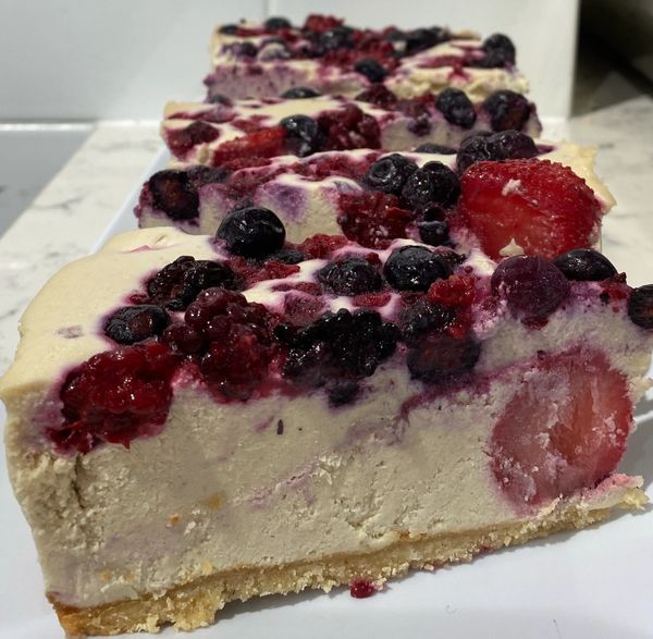 All Organic Ingredients: Macadamia cookies base, cashews, coconut cream, cacao butter, macadamia nuts, vanilla bean, mixed berries.