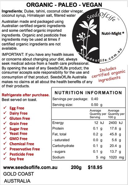 All Organic Ingredients: Tahini, dulse, coconut cider vinegar, coconut syrup, filtered water, himalayan rock salt.