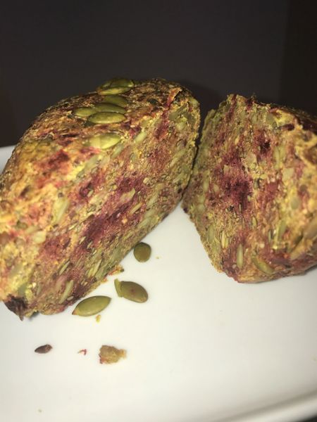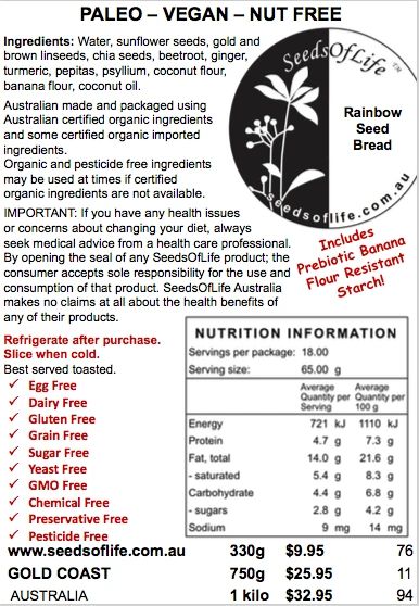 All Organic Ingredients: Beetroot, turmeric, ginger, pepitas, chia seeds, linseeds, sunflower seeds, psyllium, banana flour, coconut flour, coconut oil, water.