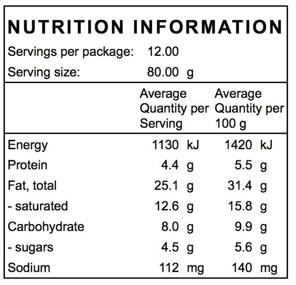 Almond meal, chia seeds, bicarb, water, coconut, coconut oil, cacao butter, coconut nectar, cashews, Himalayan salt.