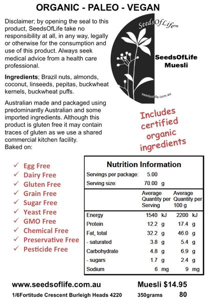 Organic Roasted - brazil nuts, coconut flakes, almonds, pepitas, buckwheat kernels and linseeds.