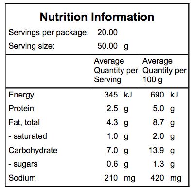 Milled seed loaf: Cassava, coconut, chia, linseeds, psyllium, pumpkin seeds, water, bicarb, lemon juice,