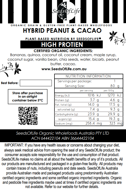 Bananas, quinoa, chia seeds, coconut cream, coconut sugar, filtered-water, bicarb, cacao, peanut butter.